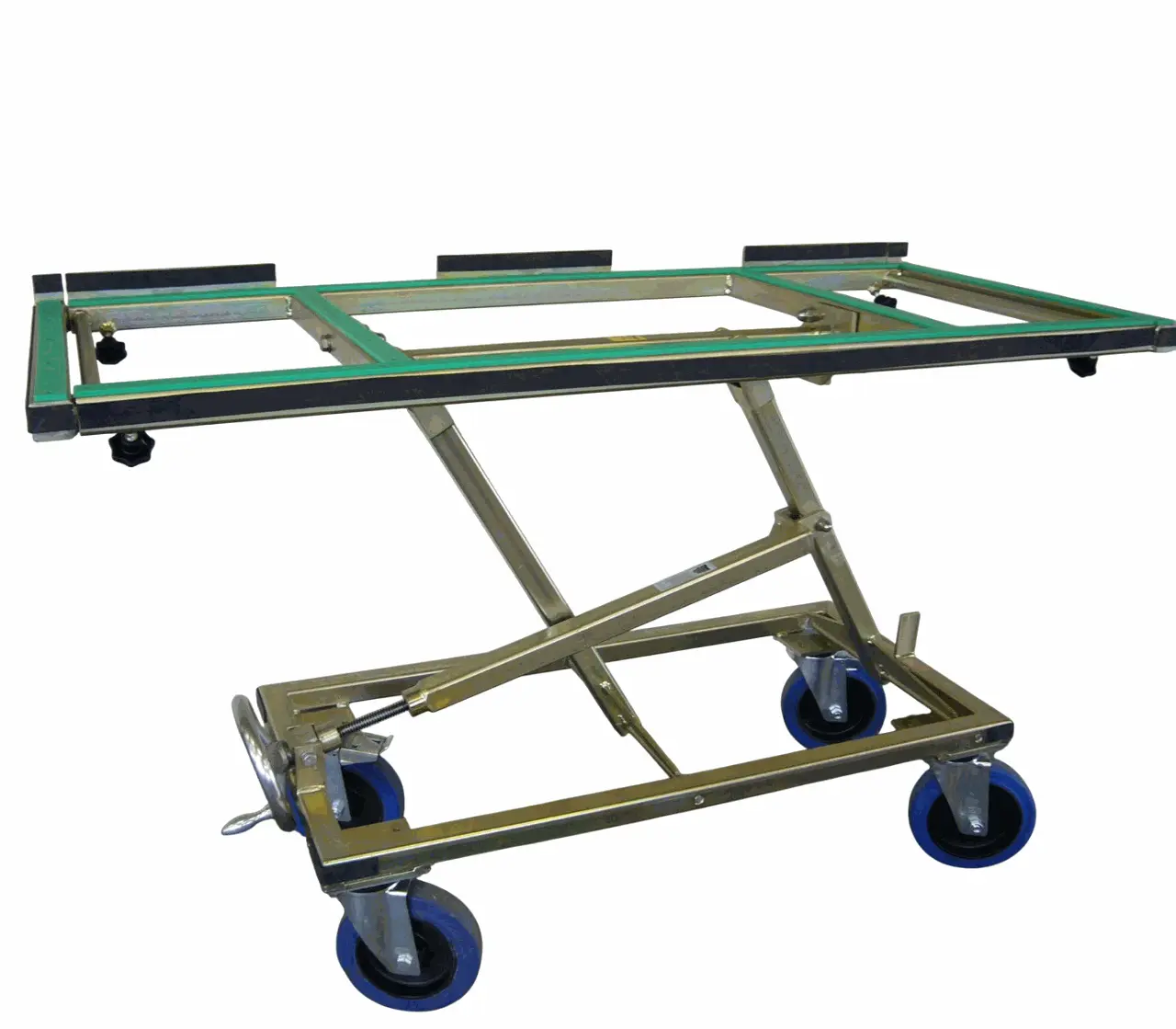 Speciale wagen voor het transporteren en plaatsen van zware aanrechtbladen op een veilige en vooral ergonomische manier. Het draagframe is verstelbaar in lengte en hoogte en manueel moeiteloos kantelbaar.