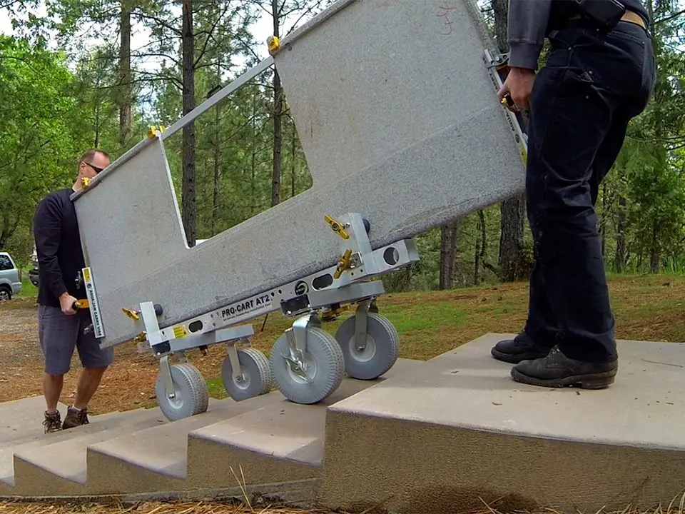 Transporteer eenvoudig en veilig zware stenen platen op deze kar. Ontwikkeld om over elk terrein te kunnen rijden. Door de hoge ophaning rust de kar gemakkelijk op trappen. Zeer lichte en robuuste uitvoering van 29kg en een hoge capaciteit van 450kg). De banden zijn vlekvrij, schokabsorberend en flat-free.